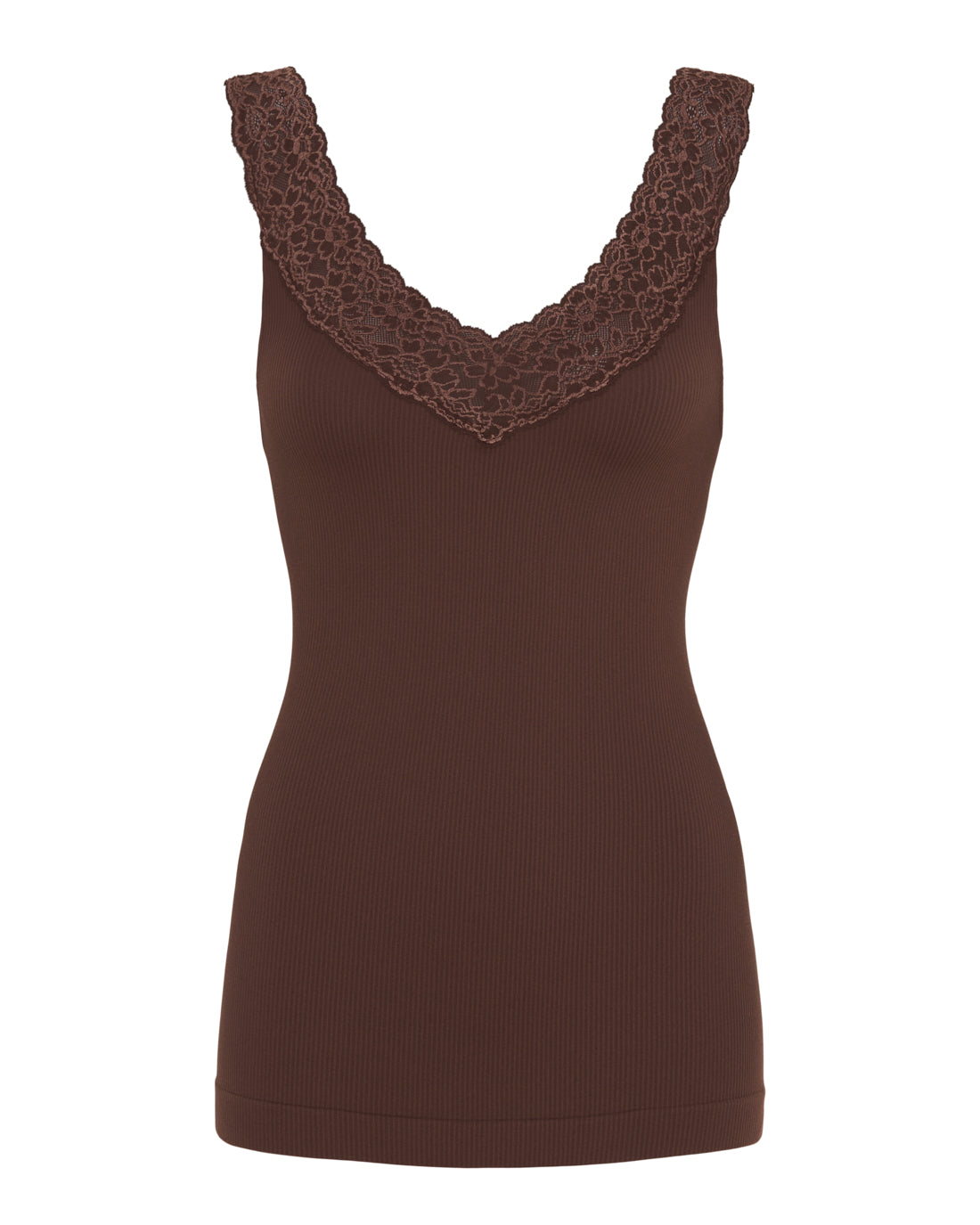 Dit is écht zo'n hemdje waar je niet genoeg van kunt krijgen en hebben! De ronde hals is prachtig afgezet met elastisch kant en het kant loopt door op de ronde rug. De hemdjes van Tim & Simonsen zijn ontworpen door de vriendinnen Tim en (jawel) Simonsen en ze worden geproduceerd in het mooie Italië. Helemaal rondgebreid, dus geen zijnaden én geen kriebelende labeltjes! De top Frida heeft ribbeltjes en is gemaakt van een microfiber stof (polyamide) met elastaan. Dus lekker stretchy en super comfortabel! Deze hemdjes zijn heel cool om te combineren met al jouw outfits want er is altijd een kleur die er goed bij past. Er zijn twee maten. S/M en L/XL. Dat is vanaf maat 36 t/m 44. De hemdjes zijn geschikt om het hele jaar door te dragen. Waarschuwing: uiterst verslavend!
